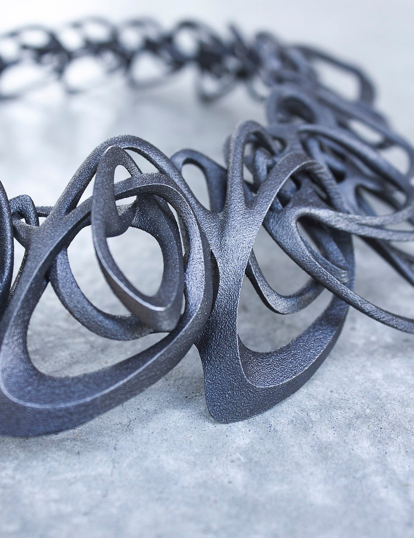 "Created with 3D printers and unlikely jewelry materials like nylon and steel, Wu's pieces look more like futuristic art than jewelry."