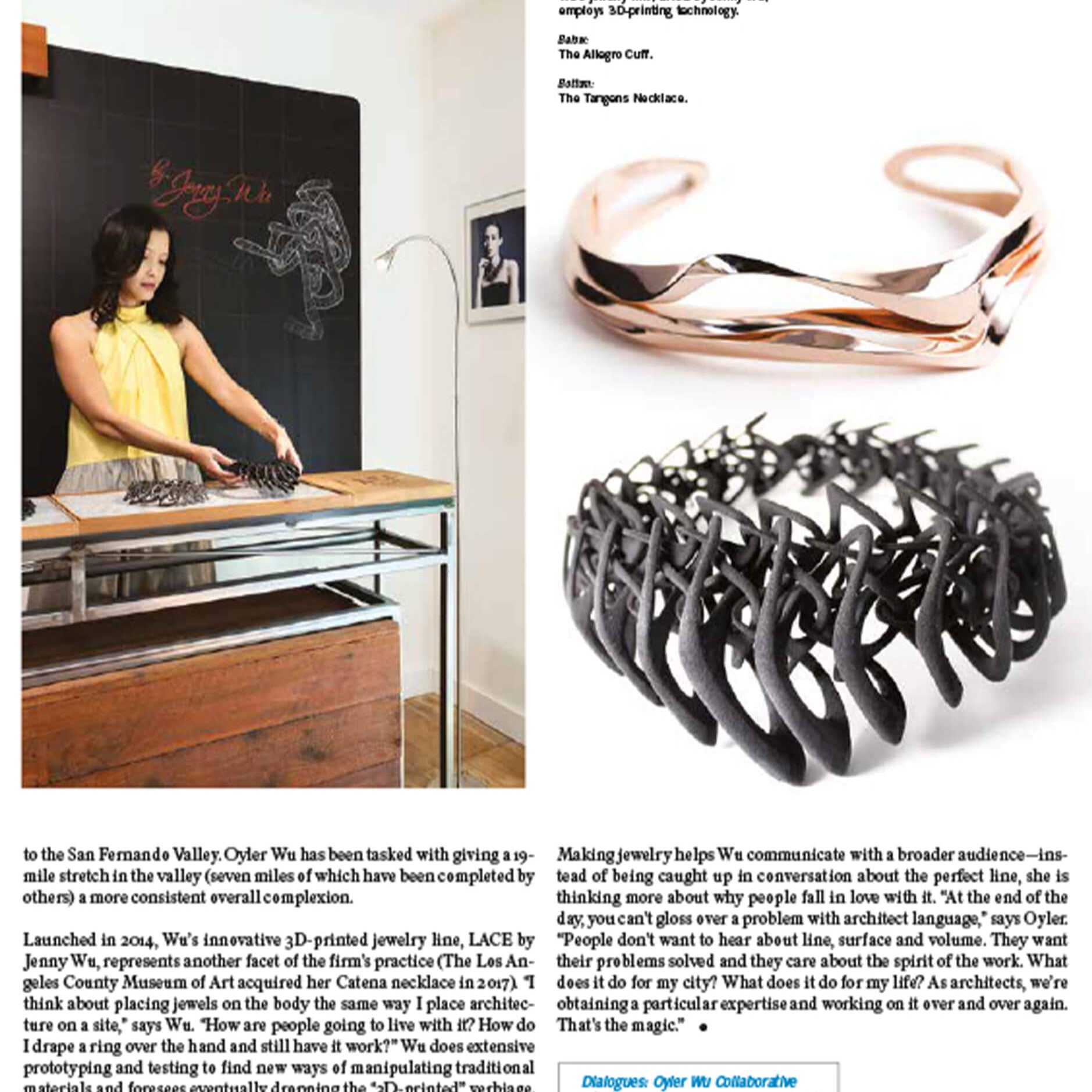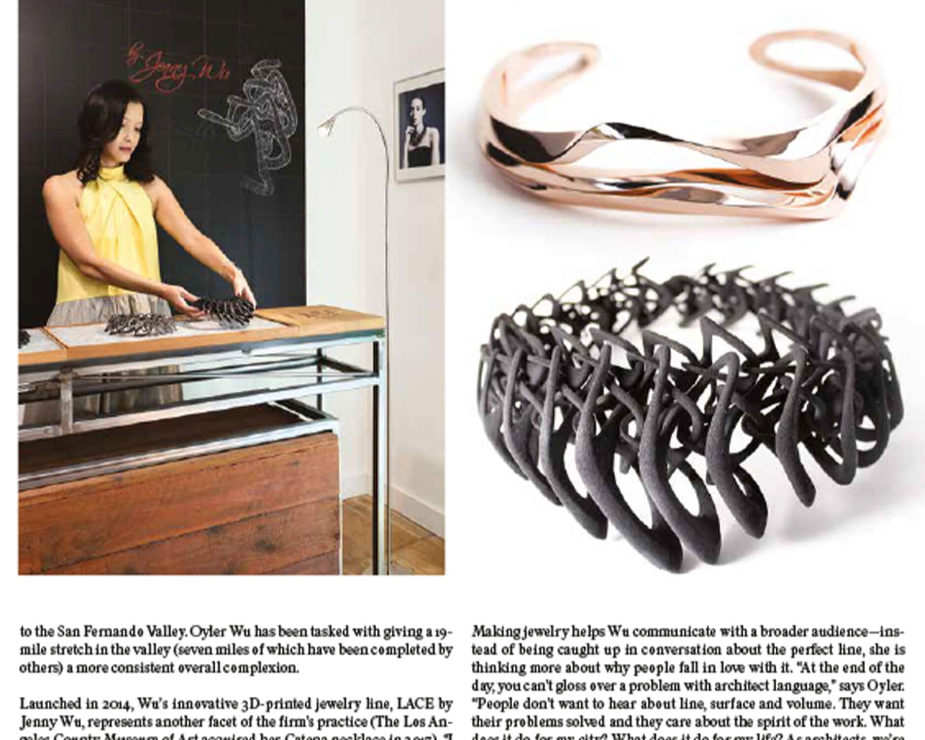 In 2014, I started my jewelry brand, LACE by Jenny Wu, as a passion project that merged my love for design and technology with fashion. Because of my experience with 3D printing technology from my architectural background, I launched this brand as an entirely 3D printed collection, printing in materials such as carbon fiber, stainless steel, and precious metals. Being a pioneer in translating this technology in producing jewelry, my brand quickly catapulted as a leader in this industry, producing statements pieces that are unique in its design, production, and material quality.
