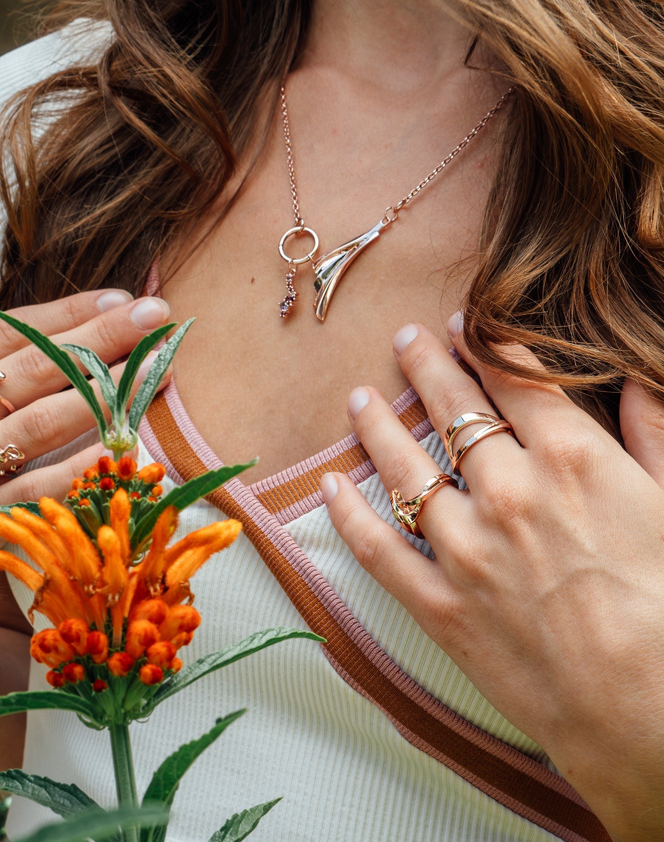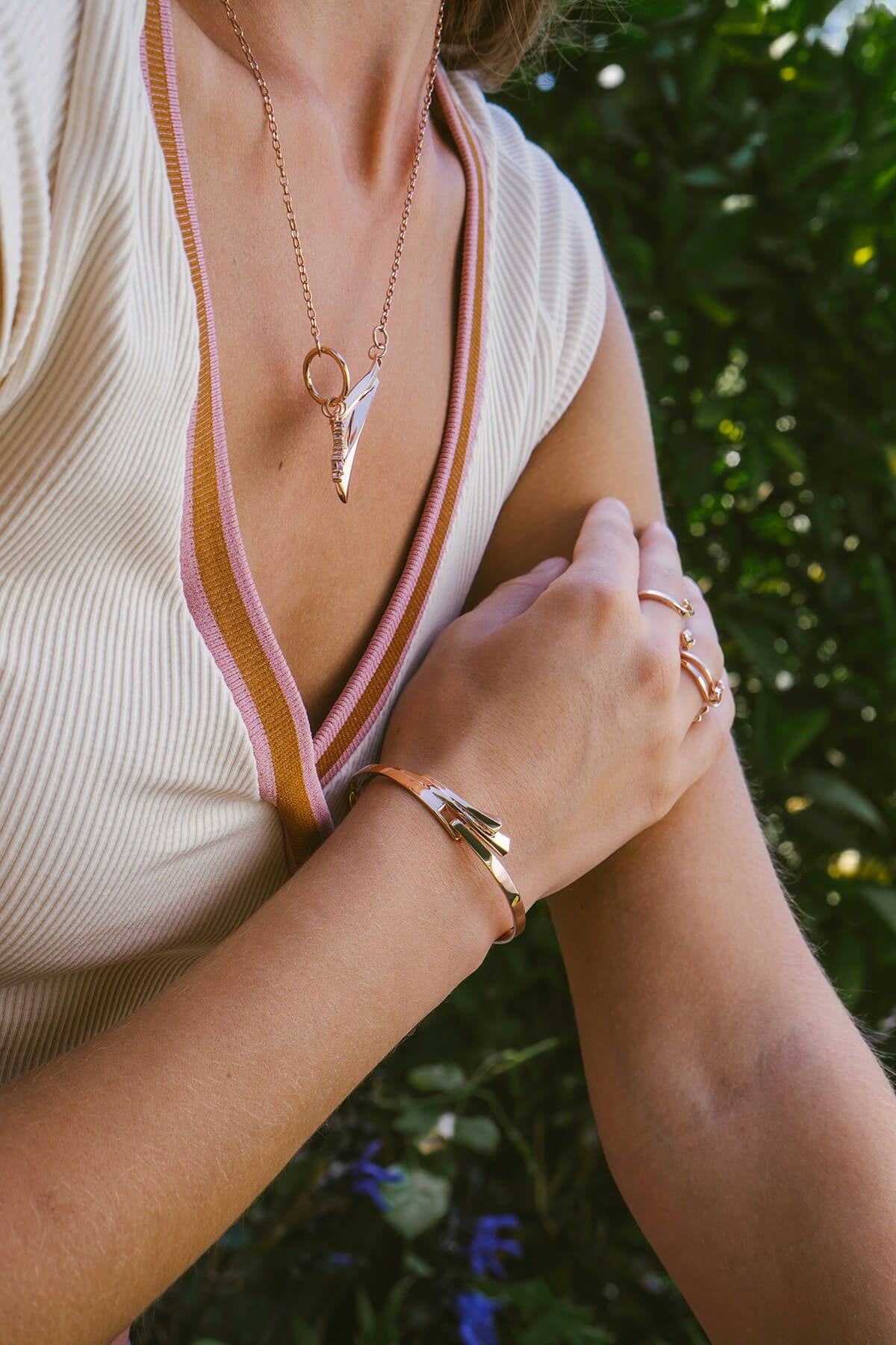 Autumn finds its voice in sculptural jewelry that moves with the season. The Cascade Bracelet flows with effortless elegance, its layered forms evoking the gentle rhythm of falling leaves and the subtle textures of autumn days. It's sculptural lines create a striking statement, whether layered with other pieces or worn alone, capturing the quiet drama and modern sophistication of the season.