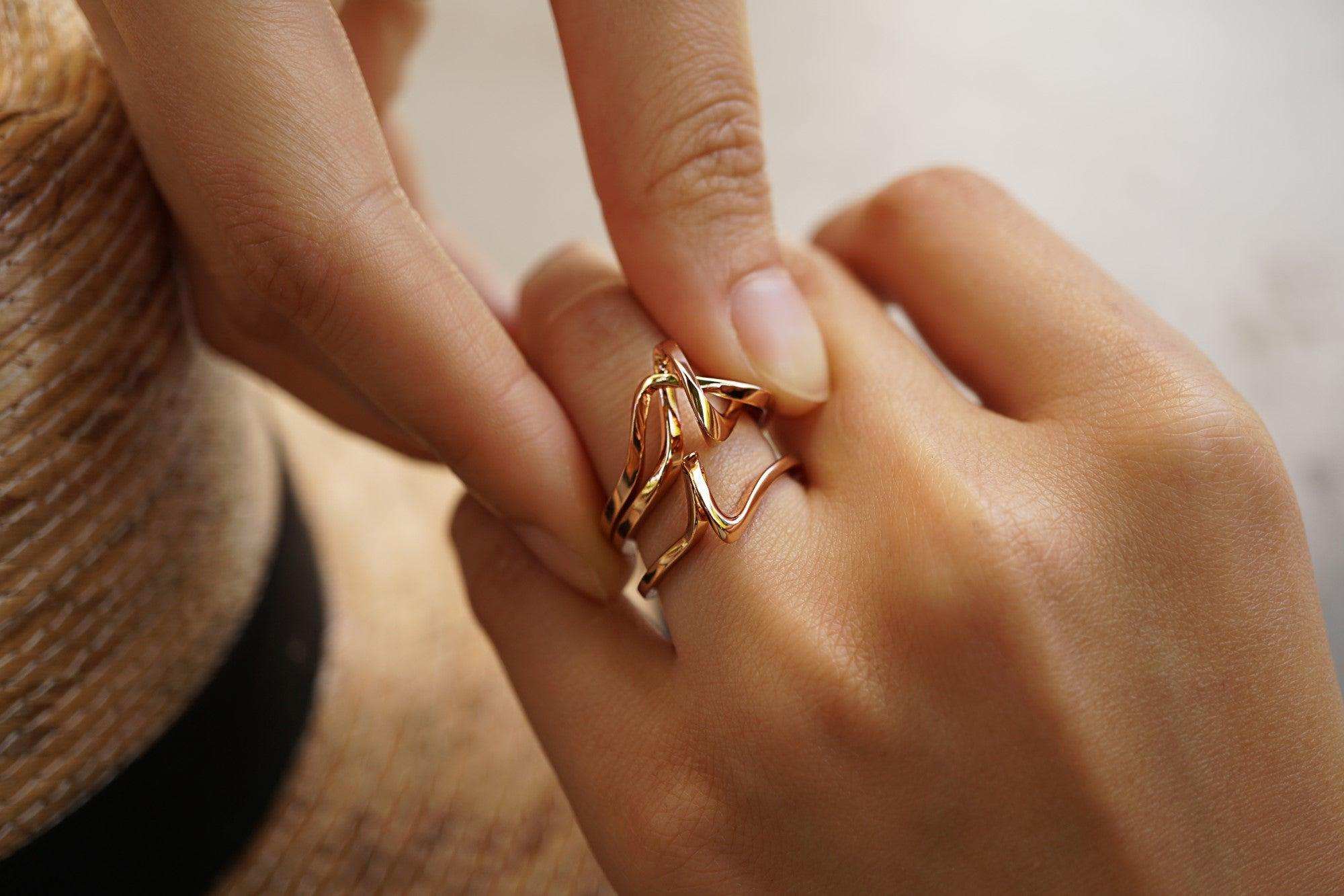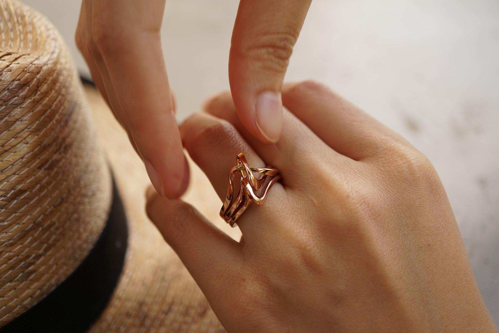 This Gift Set features our MOST popular ring combos, the Amare Ring and Sera Ring. The Amare features a loose knot that is formed by two twisting lines that merge at the back for the final union. The Sera Ring features a single, delicate knot that is formed by a simple twisting line. The two rings seamlessly nest on top of one another and appear to be one larger statement ring when worn together.