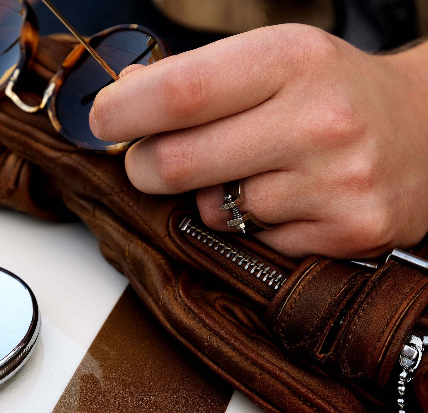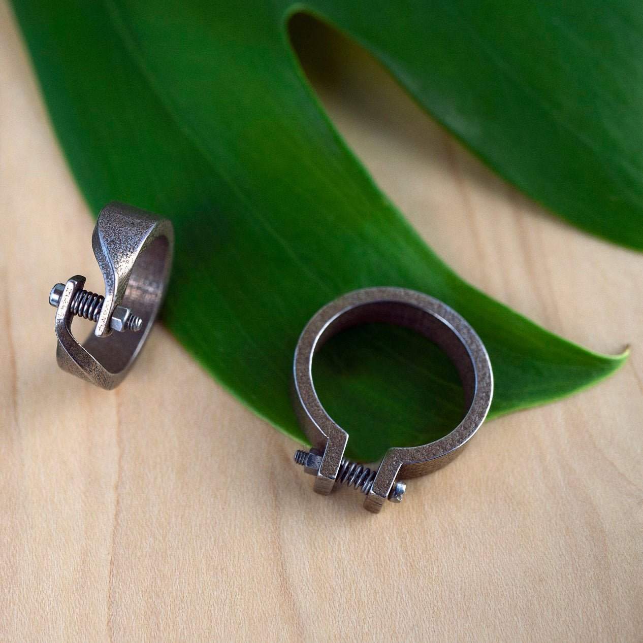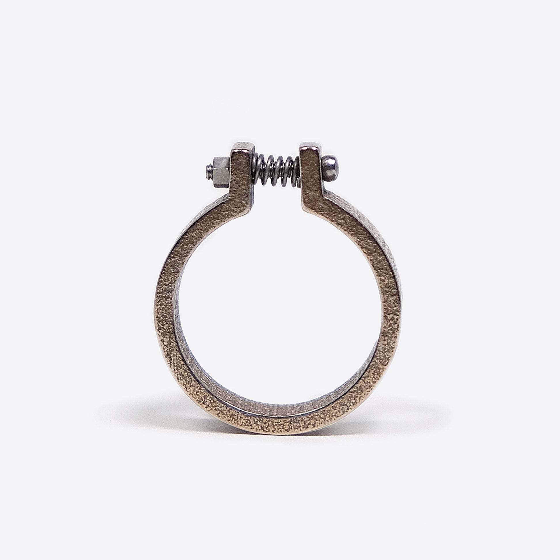 Machina Q 3D printed adjustable men's ring in stainless steel with mechanistic hardware and industrial design