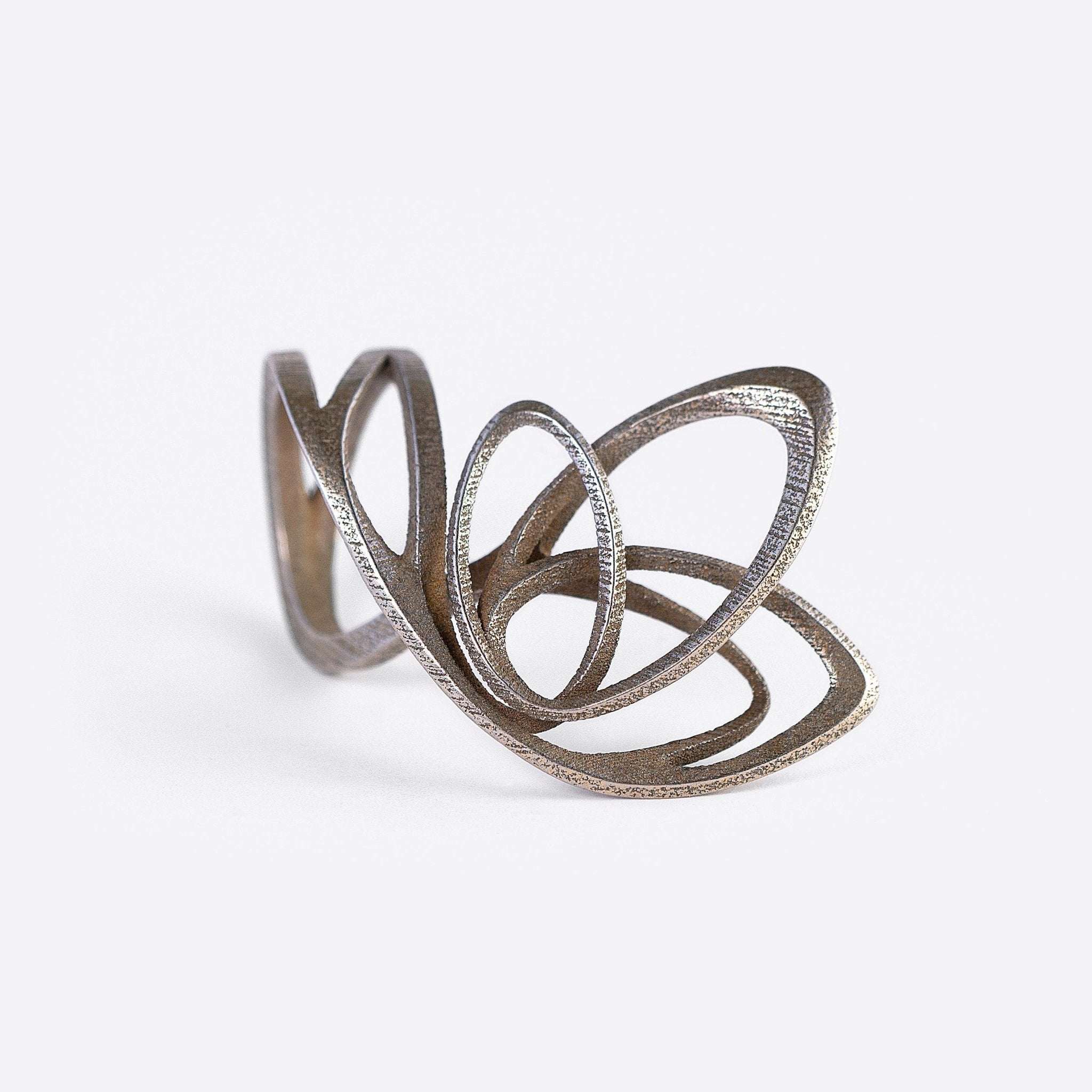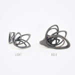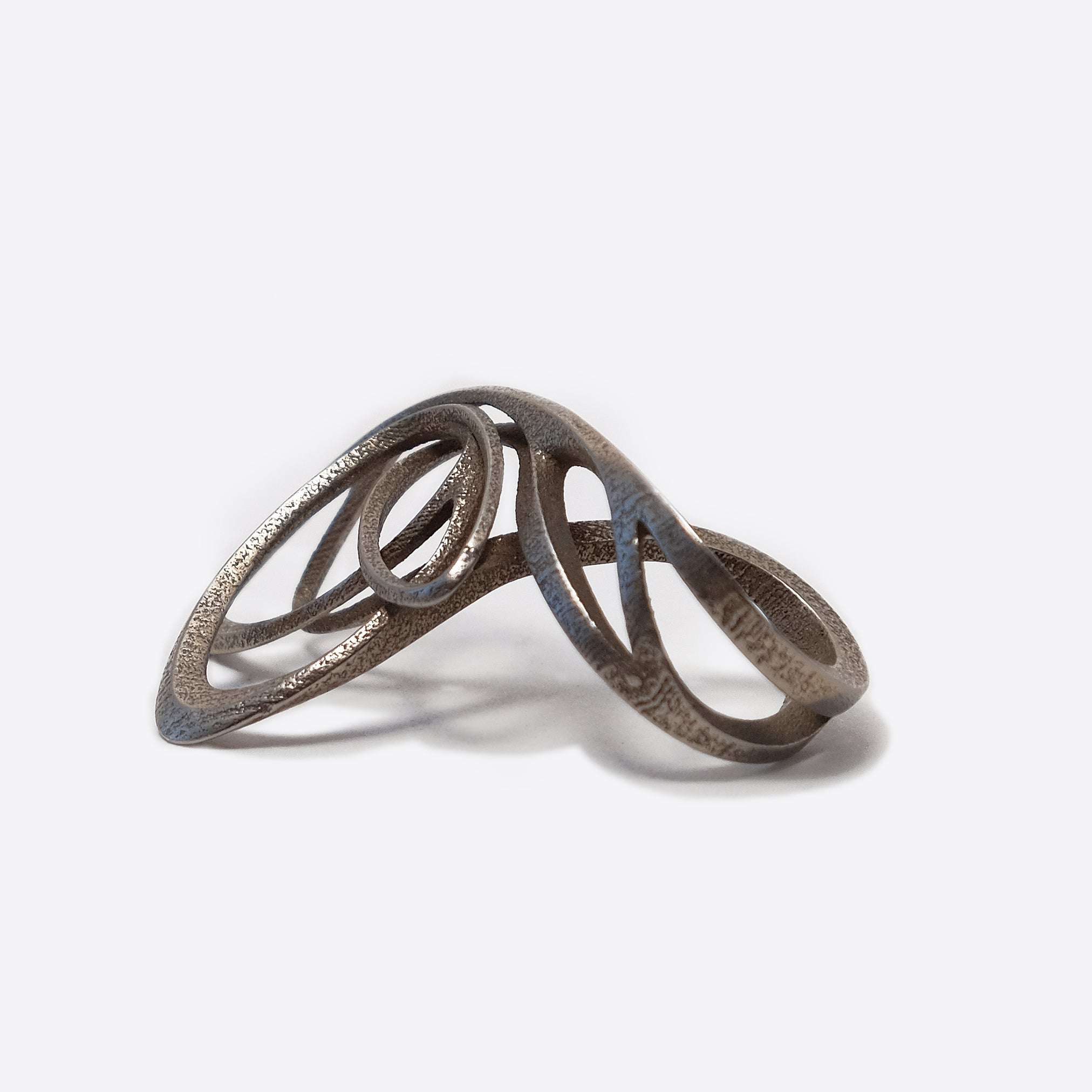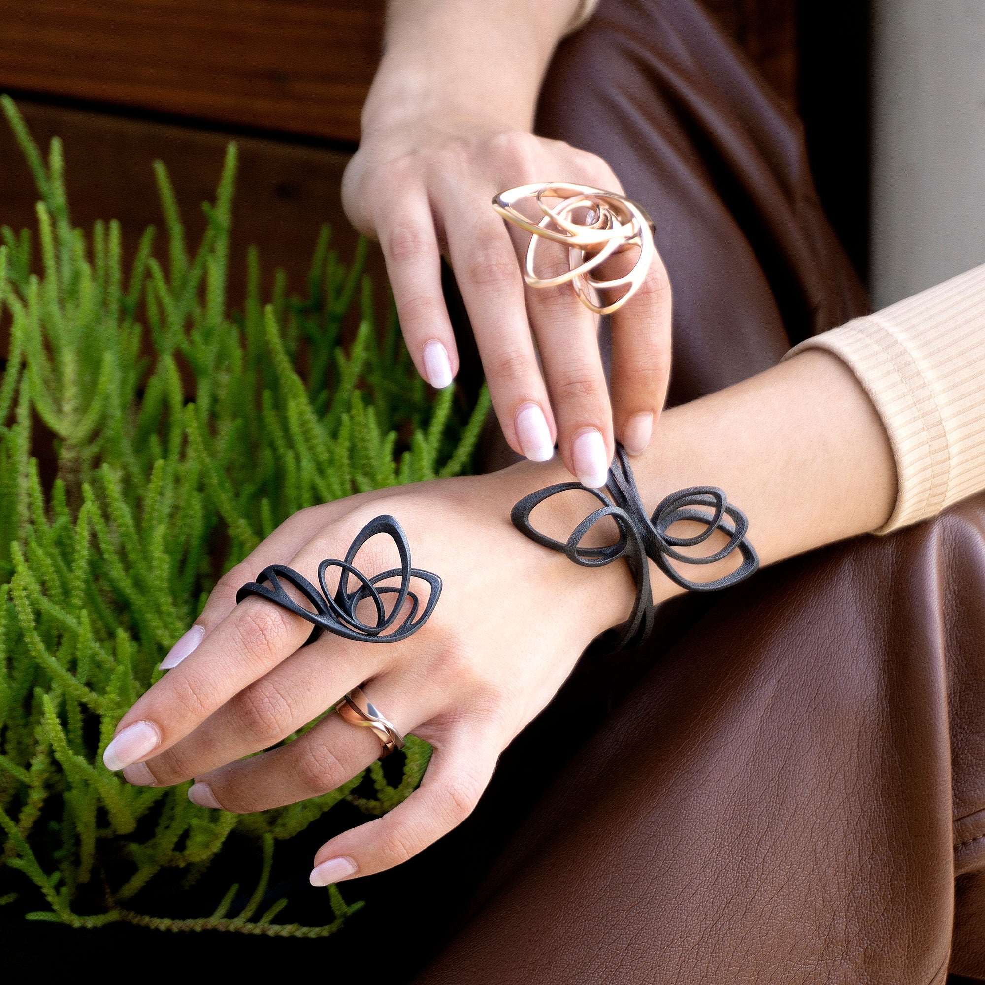 The Papilio ring is a highly refined statement ring that extends across the hand. The design features four of our signature, elliptical “petals” in varying sizes which gracefully connect back to the finger with intricate edge detailing and fluid intersection. Often paired with our Mobius Bold or Mobius Light ring (each sold separately) you can mix and match the material finishes for a look tailored to your liking.