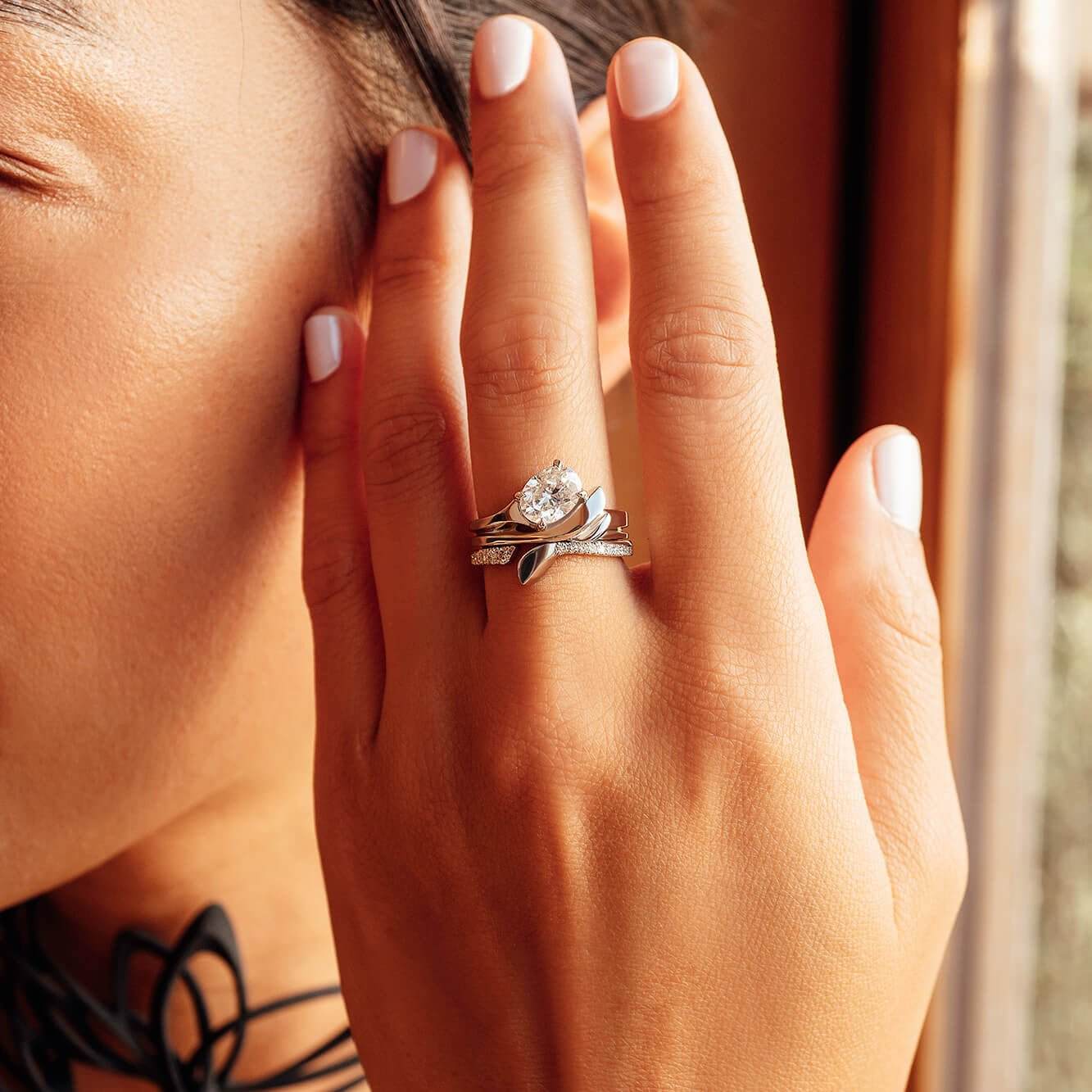 Close-up of a woman wearing a sculpted Rosae Wedding Band alongside a Calyx Engagement Ring on her finger