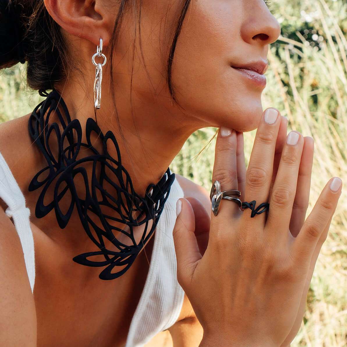 The Amare Stainless Steel Ring features a loose knot that is formed by two twisting lines that merge at the back for the final union. This ring is a companion to the Sera Ring. The two rings seamlessly nest on top of one another and appear to be one larger statement ring when worn together.