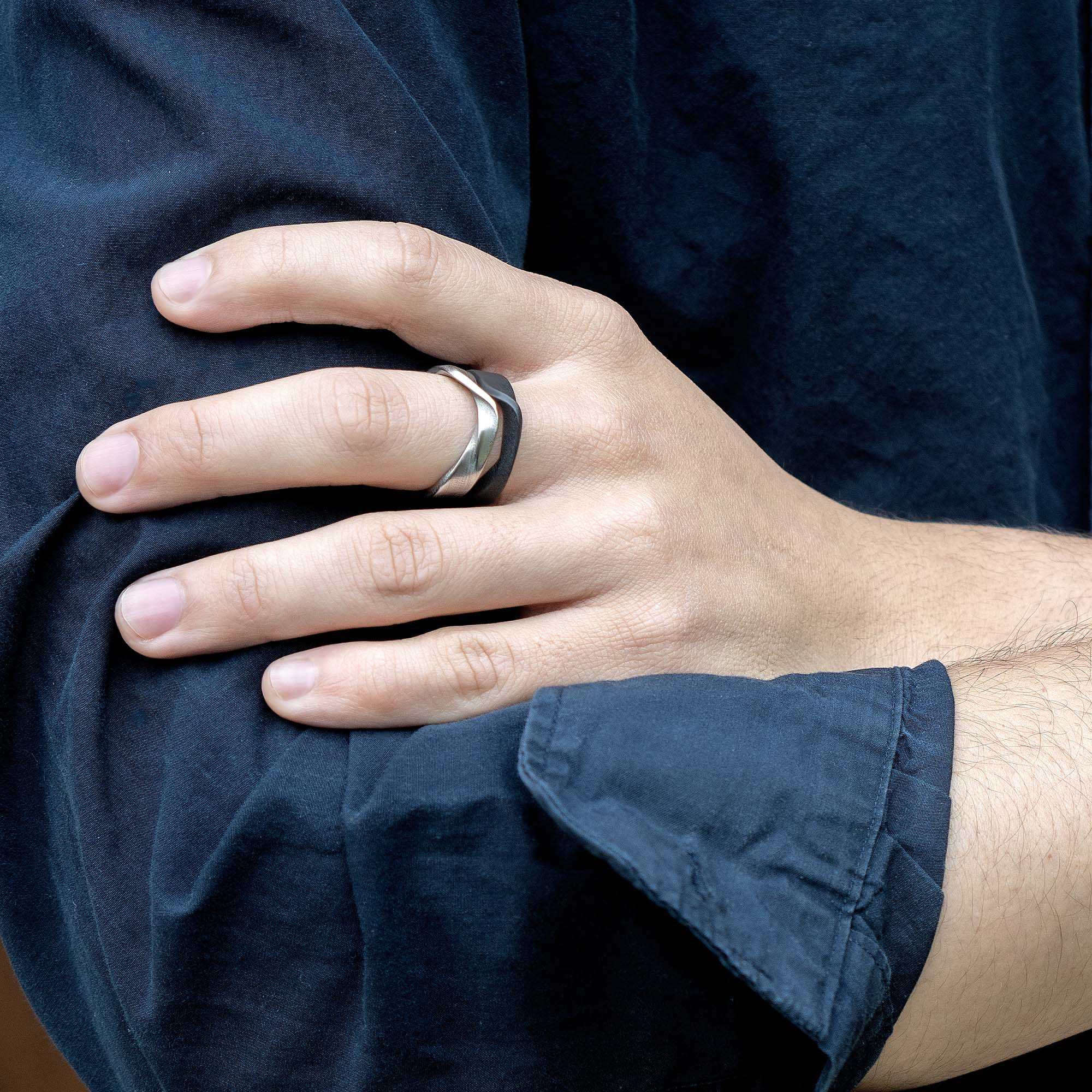 Black Amos Stainless Steel Ring with twisted band design on white background