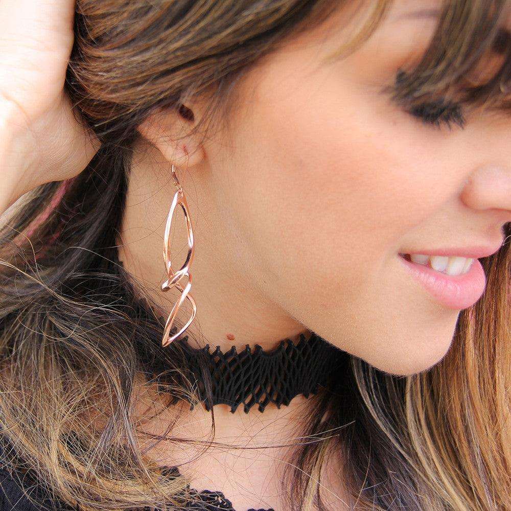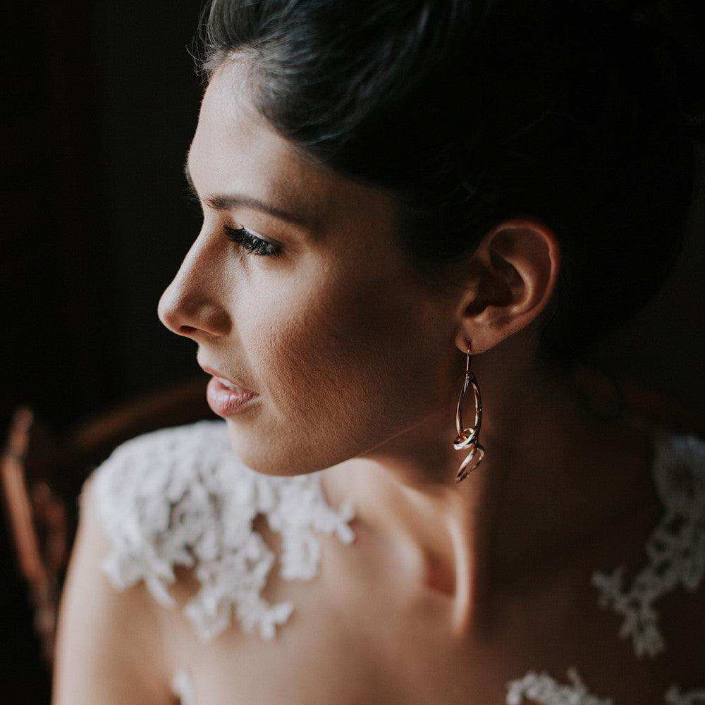 Centri Earrings in 18K rose gold vermeil with long loose knot design and elegant precision edge detailing