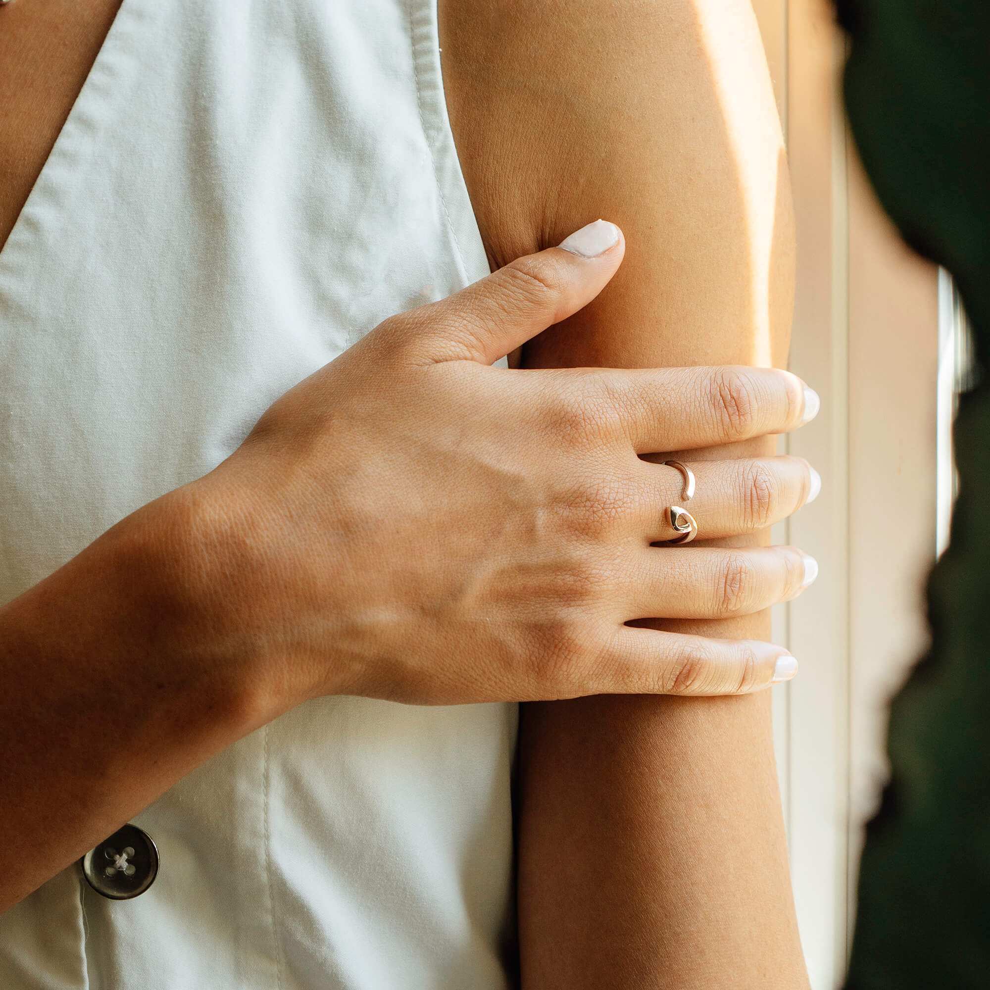 Woman wearing white dress sitting on chair showcasing Hydra Ring on finger with natural indoor background