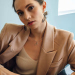 Woman wearing a delicate initials pendant necklace with three-dimensional script on a thin chain, styled as an elegant layering piece