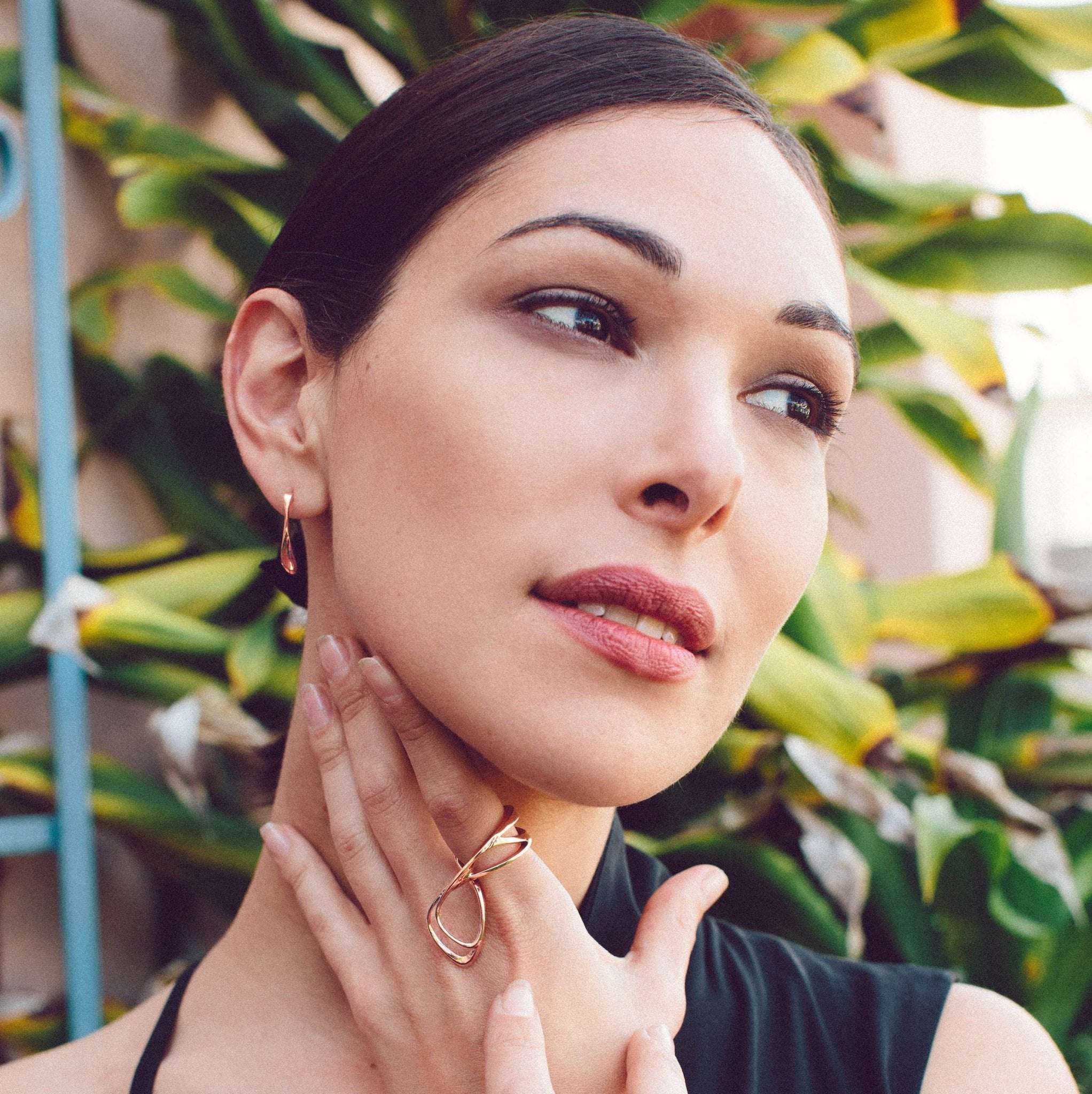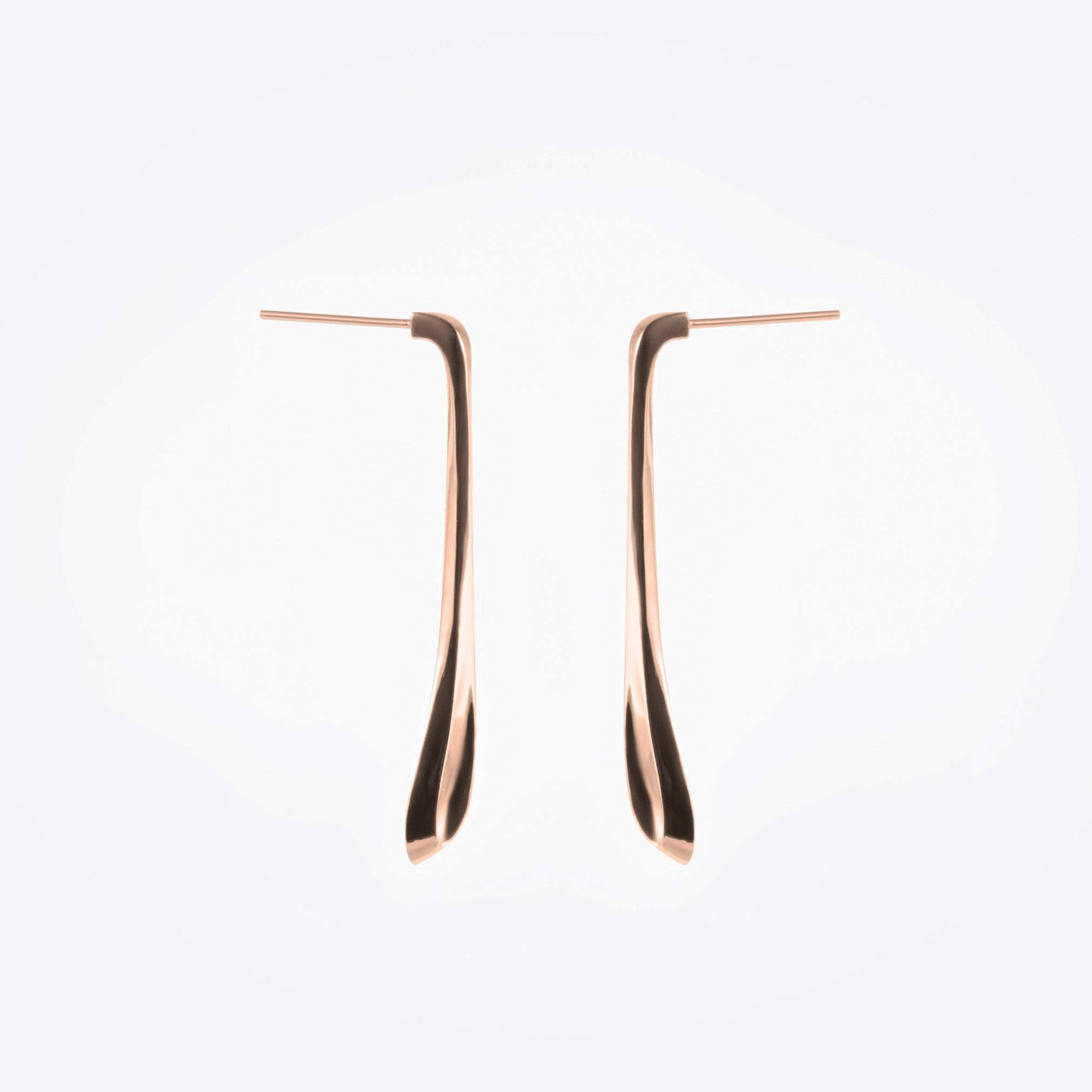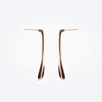 Rose gold Lini earrings with a curved drop shape inspired by a dew drop, available in bold 2-inch length.