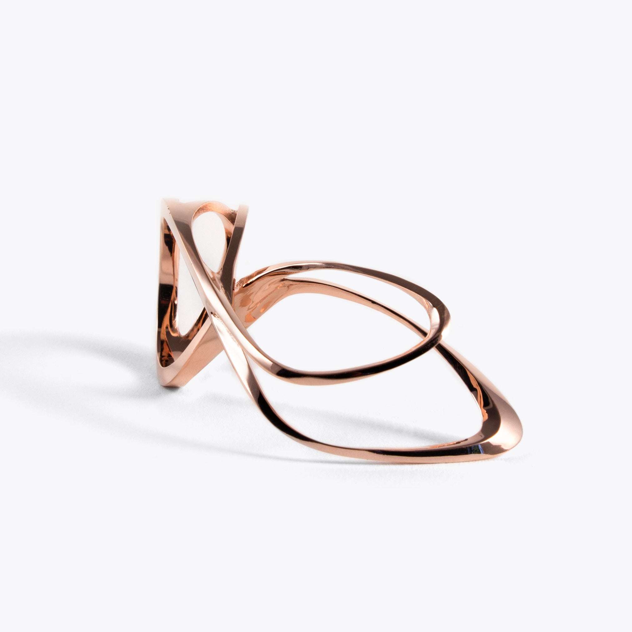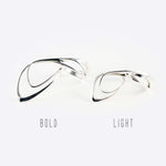 The Mobius ring engages the hand with a fluidly crafted single line that drapes and doubles over to form our signature elliptical "petal". The ring can be worn with the "petals" flowing either upright or across the back of the hand. The Mobius design comes in two different scales, Bold and Light. When paired together on separate fingers, they nest perfectly next to each other and appear to form one continuous ring.