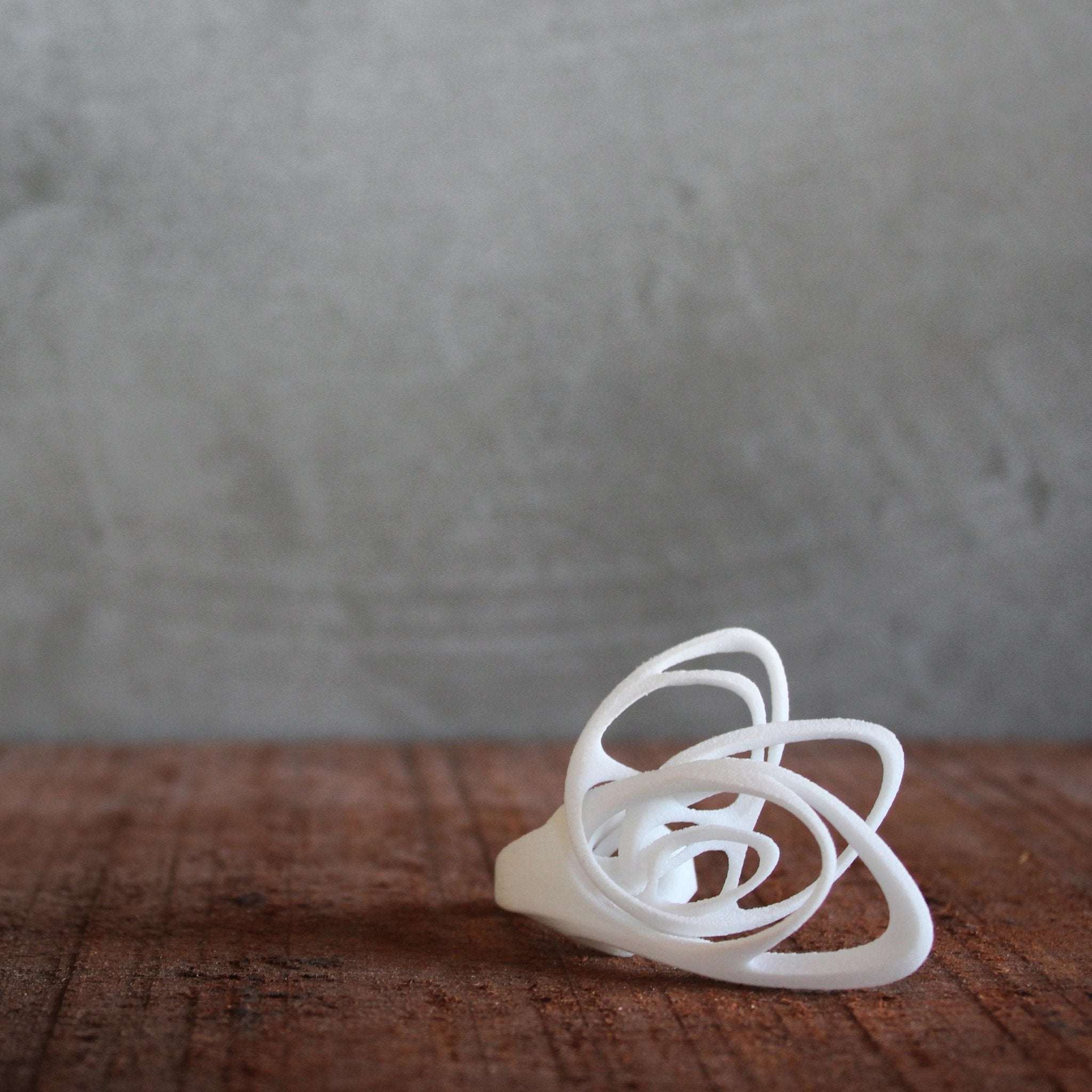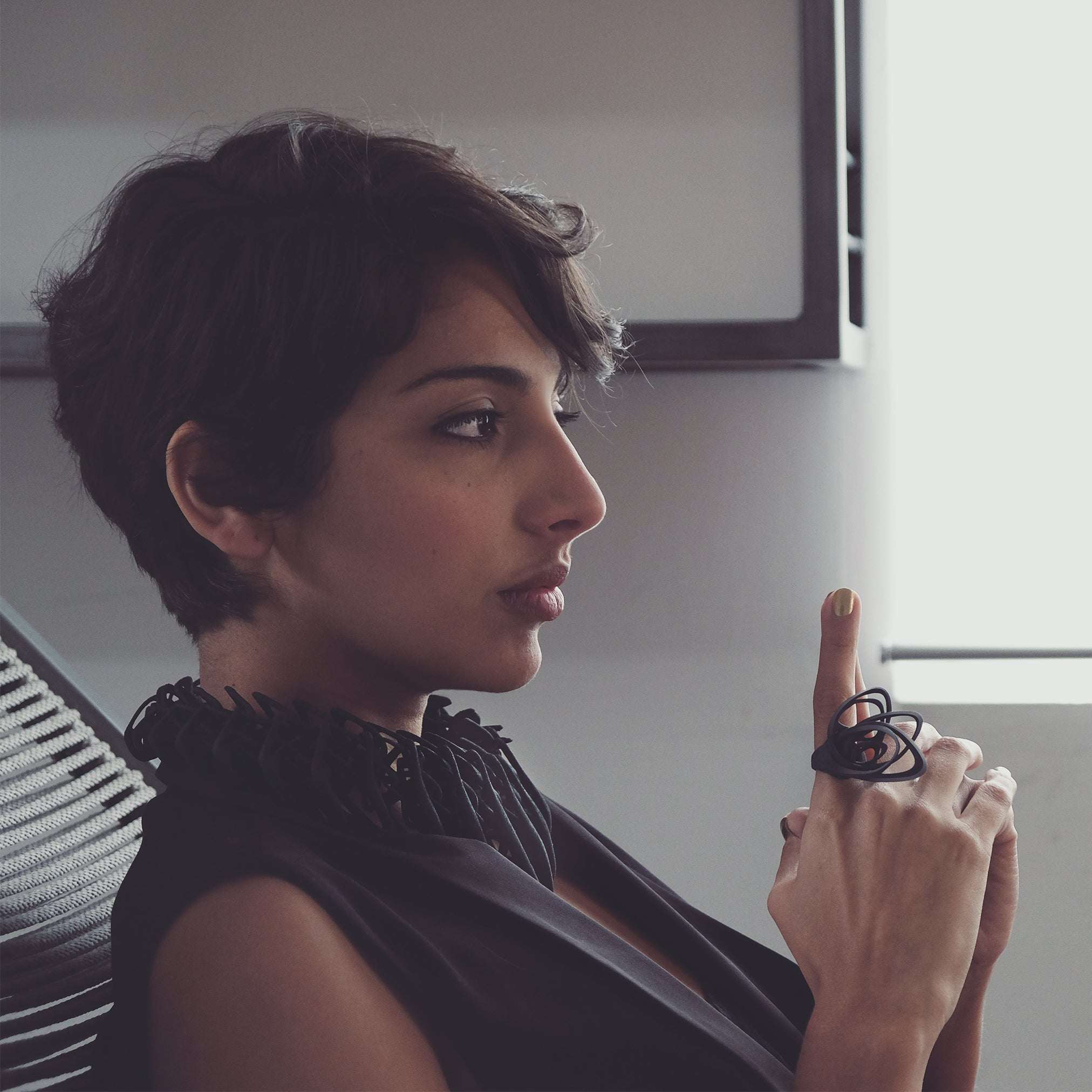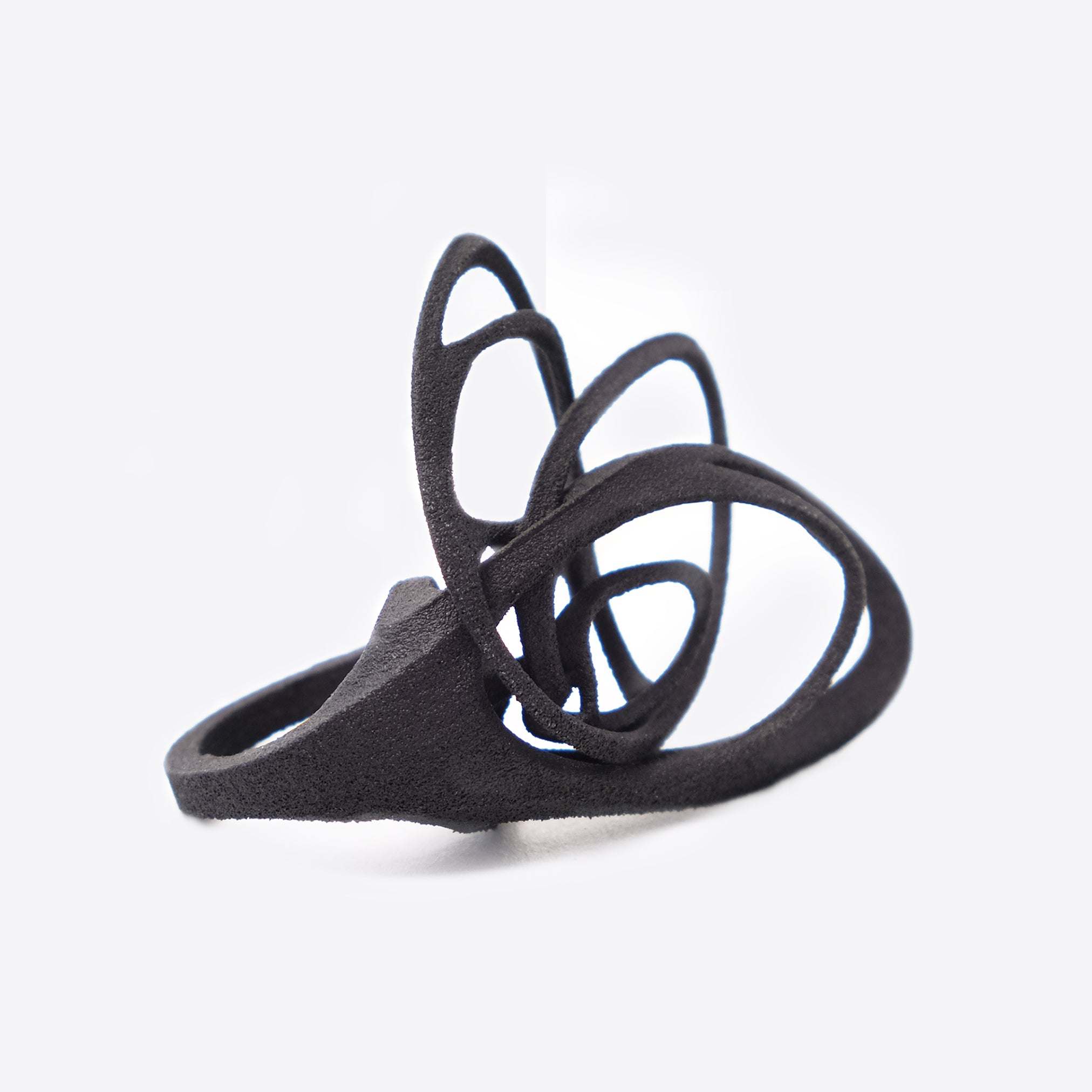 Black polished Papilio Nylon Ring with bold, elliptical petal design and intricate detailing