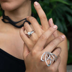 Sterling silver Papilio ring with four elliptical petal shapes and intricate edge detailing