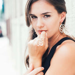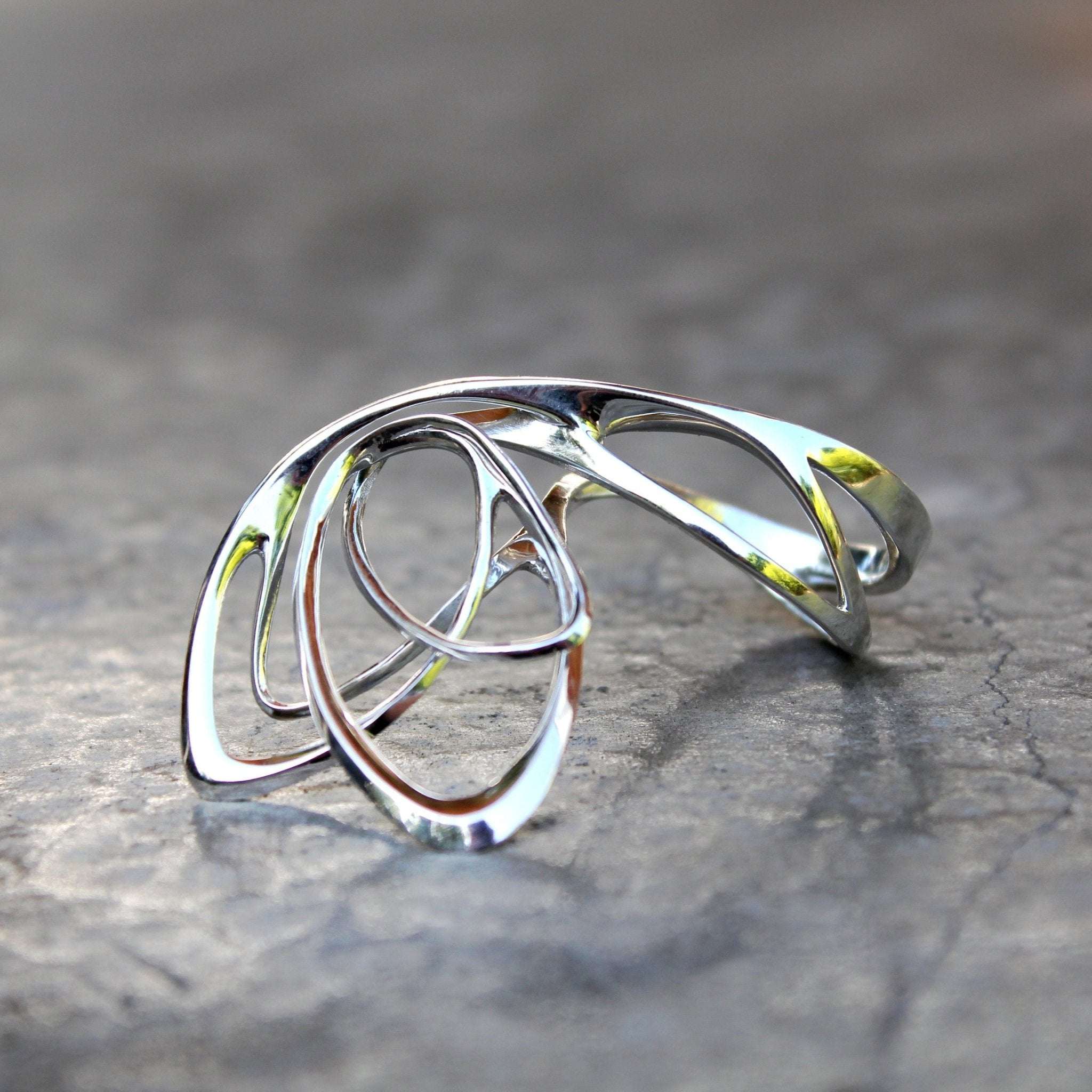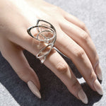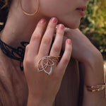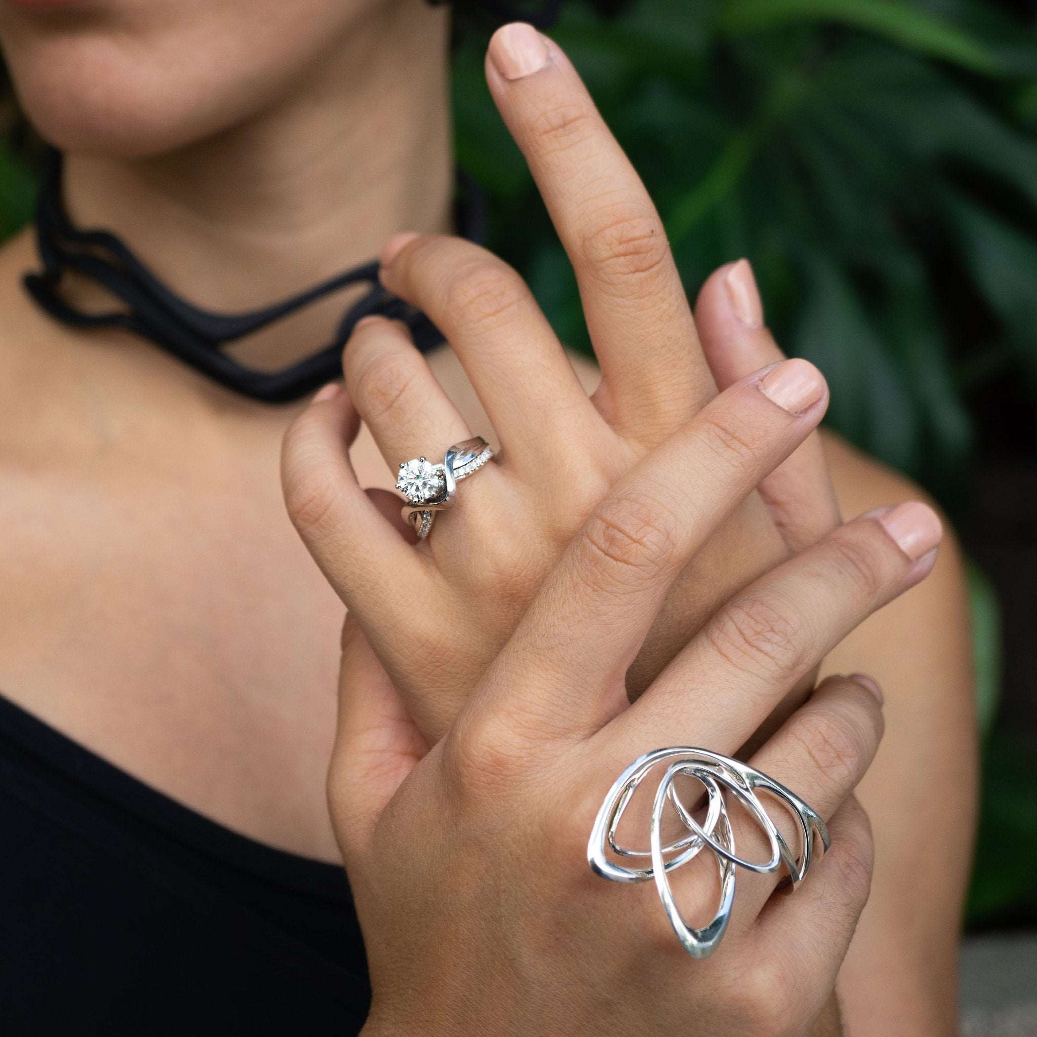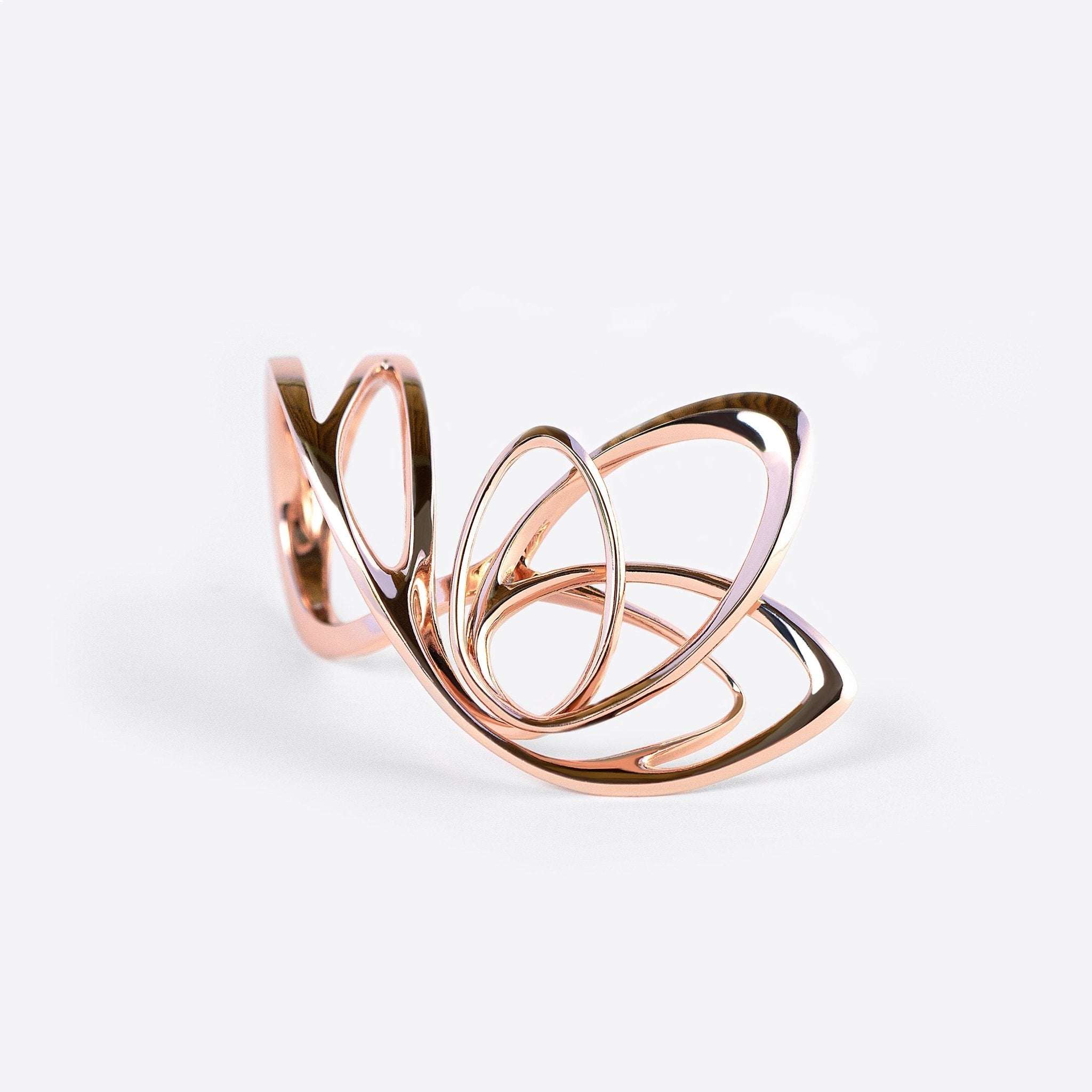 The Papilio ring is a highly refined statement ring that extends across the hand. The design features four of our signature, elliptical “petals” in varying sizes which gracefully connect back to the finger with intricate edge detailing and fluid intersection.