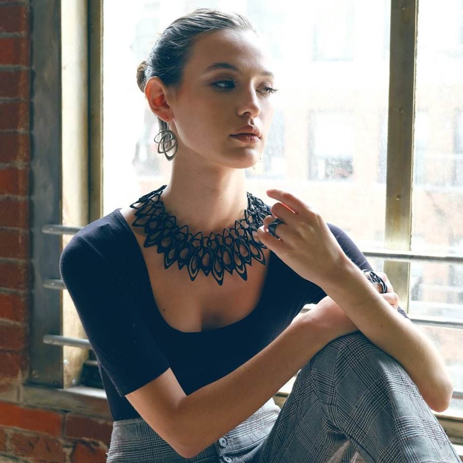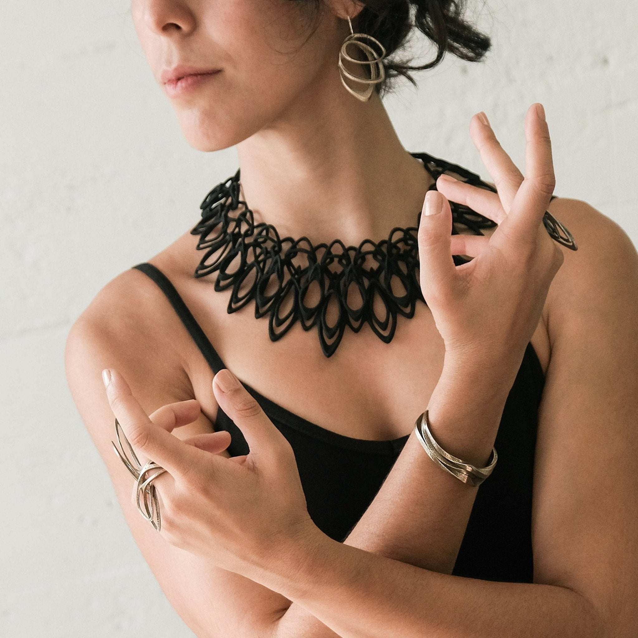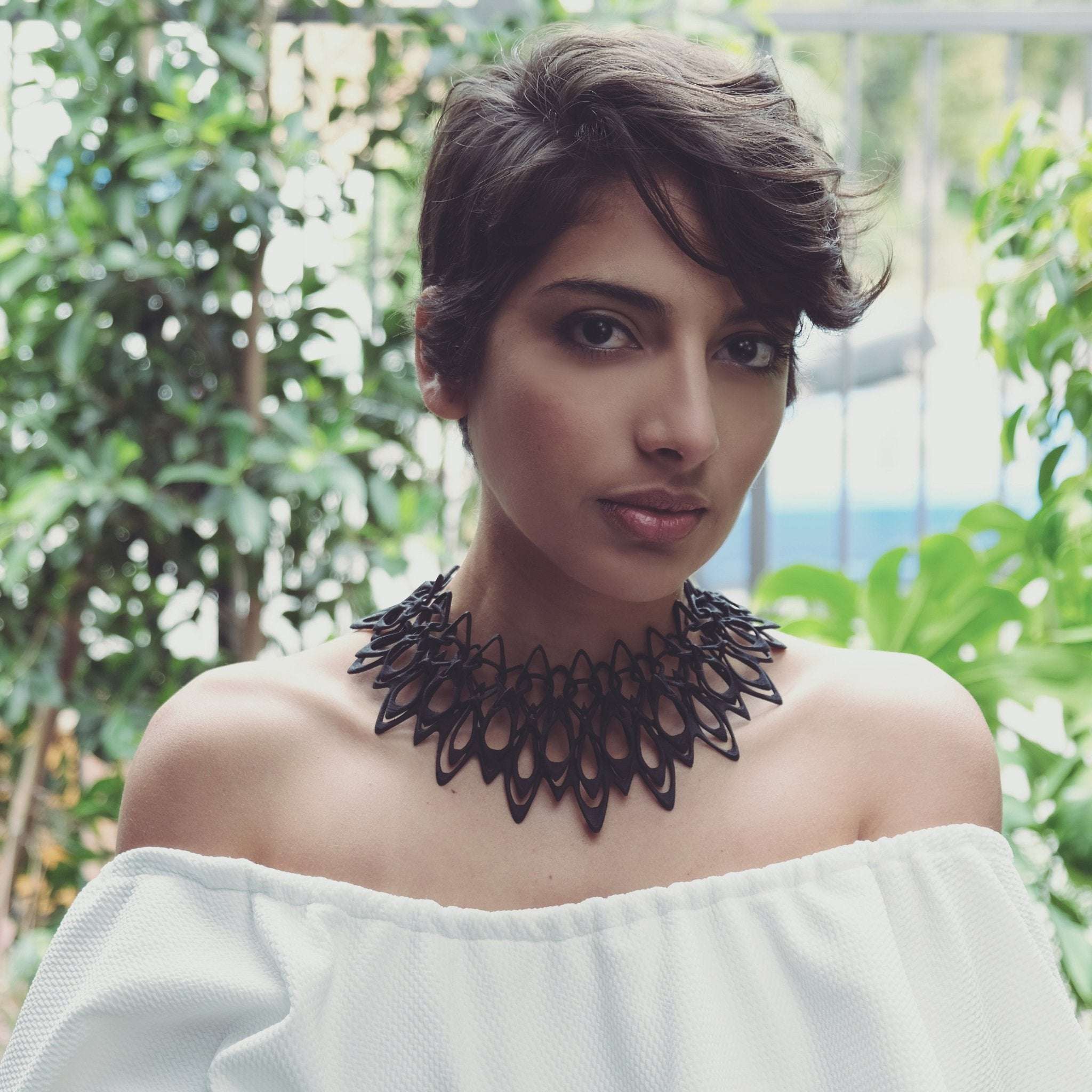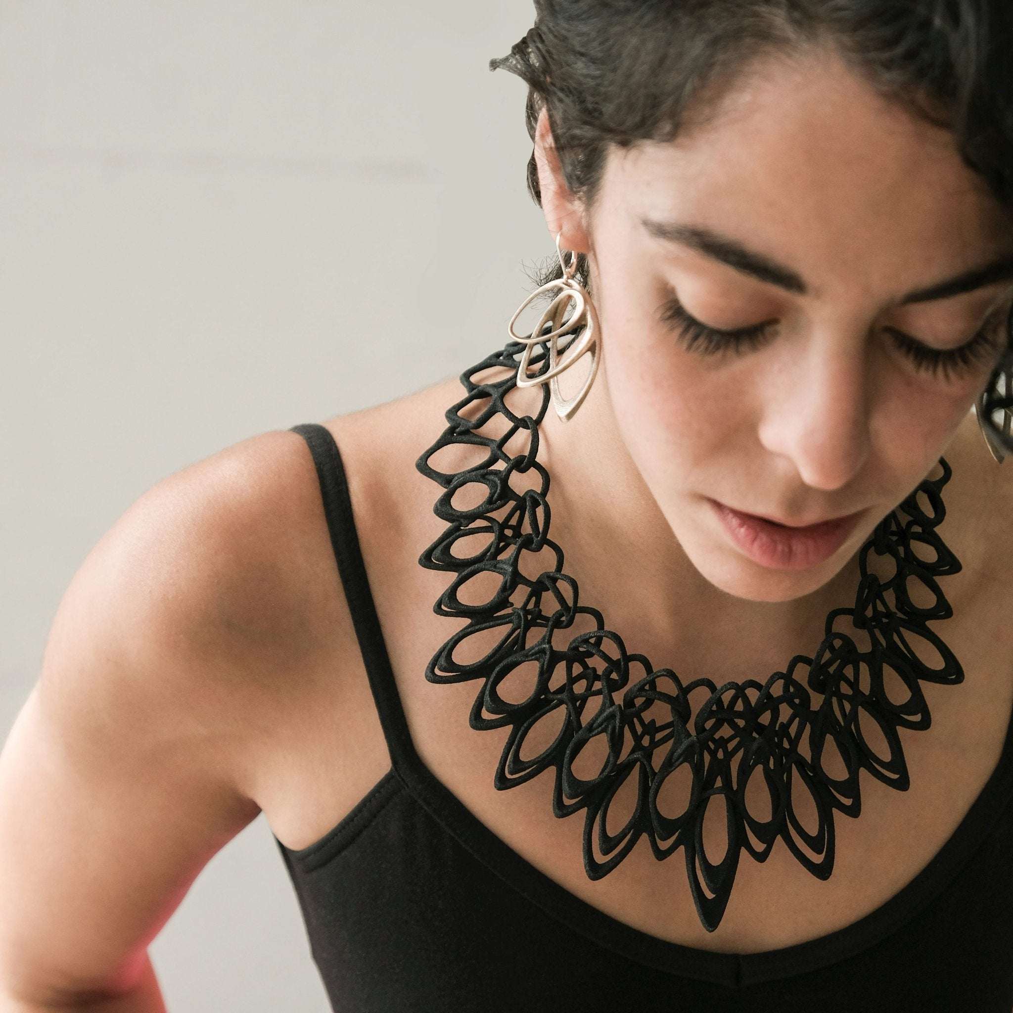 Stria Necklace black 3D printed TPU elliptical petal design flexible polymer jewelry